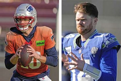 ▲ Drake Maye (izquierda), mariscal de Nueva Inglaterra, busca convertirse en el más joven en los controles en alzar el…
