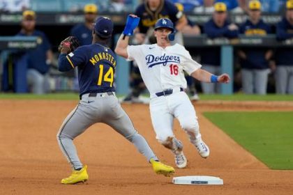 ▲ Will Smith, de los Dodgers, es puesto en out en segunda base por el campocorto de los Cerveceros, Andruw…