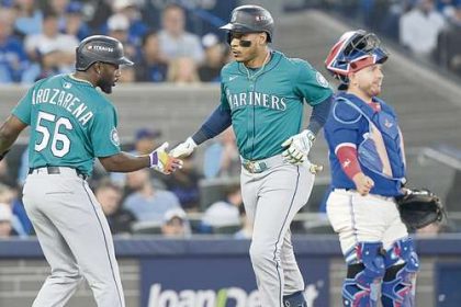 ▲ Randy Arozarena, quien produjo un imparable para los Marineros, felicita a Jorge Polanco, que conectó un jonrón de tres…