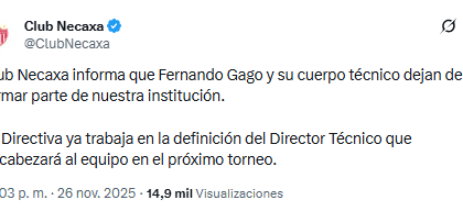 Mediante un breve comunicado, el equipo del Necaxa de la Liga MX anunció hoy, miércoles 26 de noviembre, que Fernando…