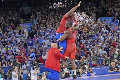 ▲ Raúl Trujillo Díaz (hincado) y Mijaín López (de rojo), durante sus últimos juegos olímpicos, en París 2024.Foto Afp Prensa…