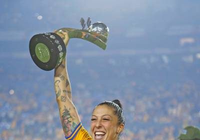 ▲ La española Jennifer Hermoso celebra el triunfo de Tigres en la final del torneo Apertura 2025 ante el América.Foto…