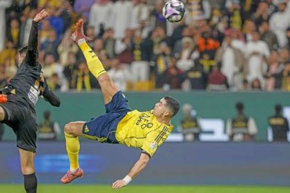 ▲ El delantero portugués Cristiano Ronaldo consigue un gol de chilena para el triunfo 4-1 de su equipo Al Nassr…