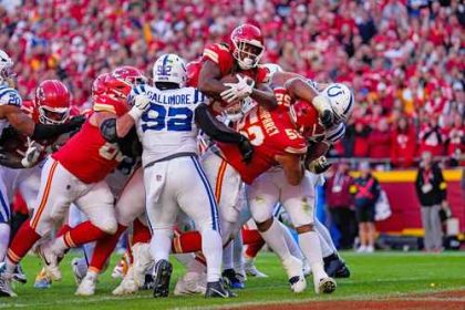 ▲ El corredor de Kansas, Kareen Hunt, salta para una anotación contra Indianápolis, durante la segunda mitad del partido de…