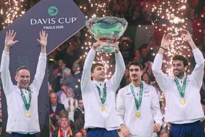 ▲ Flavio Cobolli (centro), Filippo Volandri (izquierda) y Matteo Berrettini levantan el trofeo.Foto Afp Afp Periódico La JornadaLunes 24…