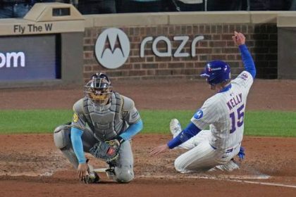 ▲ Carson Kelly, de Cachorros, anota con un sencillo productor de Matt Shaw durante la sexta entrada en el estadio…