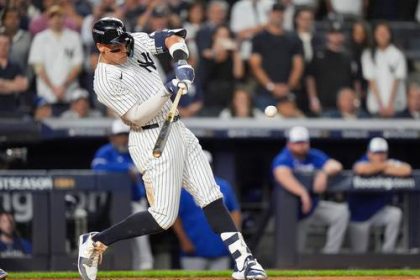 ▲ Aaron Judge, en la imagen, conectó un jonrón de tres carreras contra los Azulejos de Toronto durante la cuarta…