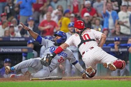 ▲ El jugador de los Dodgers de Los Ángeles Teoscar Hernández se desliza hacia el plato superando al receptor de…