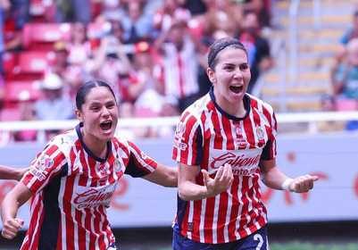 ▲ Licha Cervantes (derecha) festeja su remate de cabeza para la cuarta anotación de las Chivas al minuto 90+6, ayer…