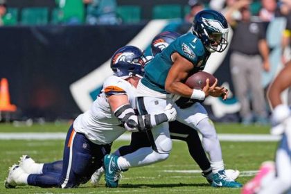 ▲ El linebacker Nik Bonito y el ala defensiva Zach Allen, de Denver, derriban al mariscal de campo de las…