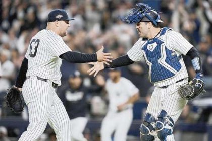 ▲ El lanzador David Bednar (izquierda), de los locales, cerró el noveno episodio de Nueva York.Foto Ap Ap Periódico…