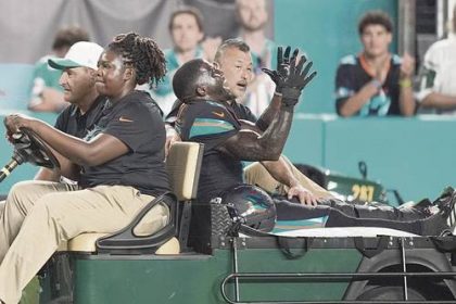 ▲ Tyrek Hill, receptor estrella de los Delfines, es llevado al hospital tras una aparatosa lesión de rodilla.Foto Ap Ap…