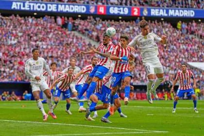 ▲ Raúl Asencio, del Real Madrid, disputa con Carlos Marín y Guiliano Simeone (20), del Atlético, el esférico en lo…
