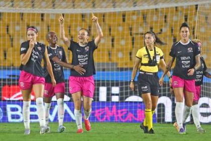 ▲ Stephanie Ribeiro celebra con sus compañeras tras marcar el primer gol del equipo local.Foto Afp De La Redacción …