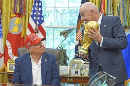 ▲ Durante el anuncio, Gianni Infantino, presidente de la FIFA, entregó a Donald Trump el trofeo de la Copa del…