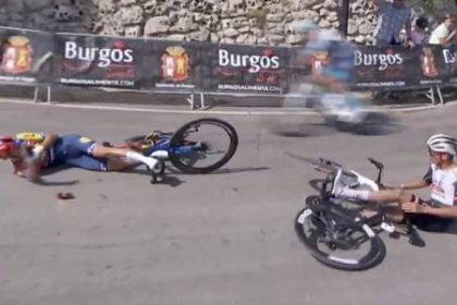 ▲ Captura de pantalla del momento en que el mexicano (derecha) cae y derriba también al italiano Giulio Ciccone, ayer…