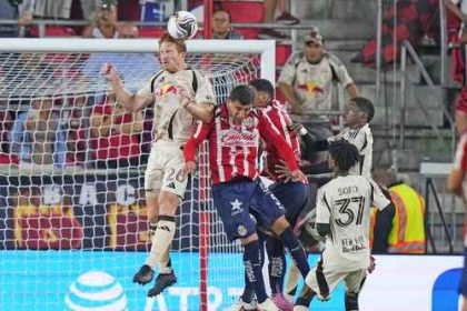 ▲ Tim Parker, de Toros Rojos de Nueva York, cabecea tras ganar la posición al rojiblanco Víctor Guzmán (centro), ayer…