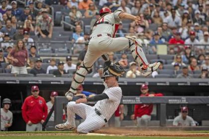 ▲ Cody Bellinger, de los Yanquis, fue eliminado en el plato por el receptor JT Realmuto en la tercera entrada.Foto…