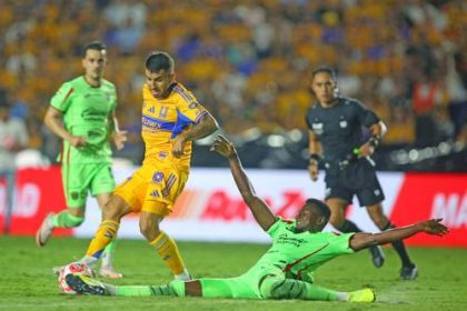 ▲ Ángel Correa, flamante refuerzo de Tigres, recibe una fuerte barrida del colombiano Moisés Mosquera, ayer durante la victoria de…