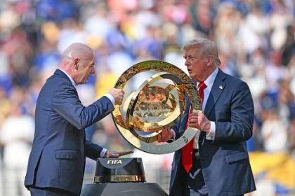 ▲ El presidente de Estados Unidos (junto a Gianni Infantino) se colocó al centro de la cancha, lo que no…