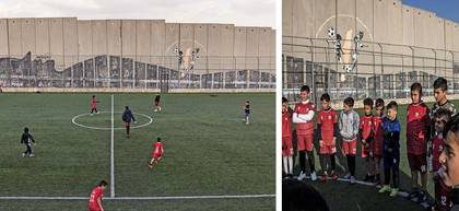 ▲ La cancha, flanqueada por un muro de hormigón de ocho metros, cargado de símbolos, es el único espacio abierto…