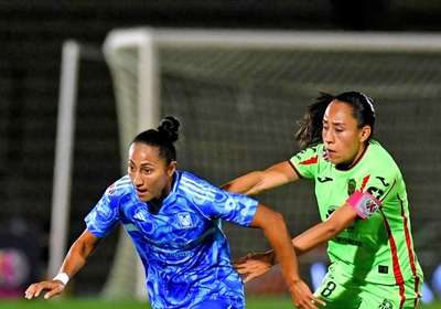 ▲ Stephany Mayor (izquierda), quien marcó el gol de la victoria, escapa de la marca de Liliana Mercado.Foto @clubtigresfemenil De…