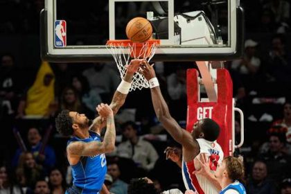 ▲ El alero de los Mavericks, P.J. Washington Jr (izquierda), y el pivote de los Pistones, Jalen Duren, luchan por…