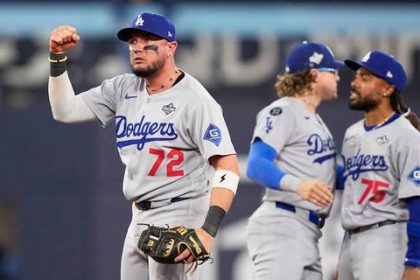▲ El segunda base de los Dodgers, Miguel Rojas, celebra la victoria sobre los Azulejos tras concretar el doble play…