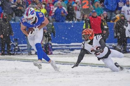 ▲ El mariscal de los Bills, Josh Allen, se impone a su contrincante de Bengalíes, DJ Turner II.Foto Ap De…