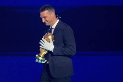 ▲ Lionel Scaloni, técnico de la vigente campeona Argentina, ayer durante el sorteo, en el que llevó el trofeo de…