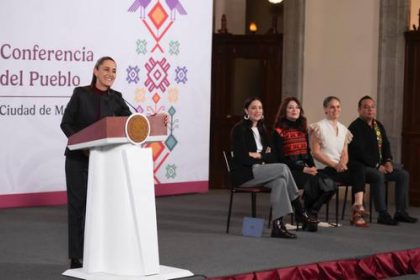 ▲ La presidenta Claudia Sheinbaum junto con las titulares de Cultura, Claudia Curiel; de Derechos de Autor, Karina Luján; del…