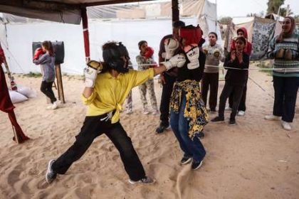 El boxeo, refugio y liberación para niñas y adolescentes afectadas por ataques a Gaza ▲ Refugiadas en el campamento de…
