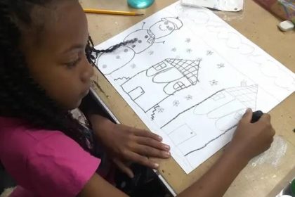 La Habana/Una niña de tez oscura y ojos enormes, vivísimos, mira a la cámara en mitad de un dibujo. Sobre…