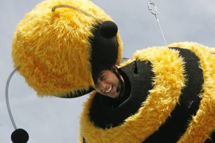 ▲ El comediante estadunidense Jerry Seinfeld se desliza por el aire conectado a un cable durante un truco publicitario de…