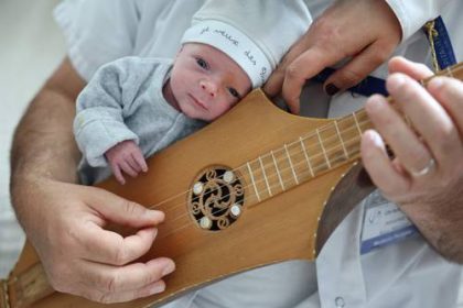 ▲ El jefe del servicio de pediatría, Bruno Menager, toca la cítara para un recién nacido durante una sesión de…