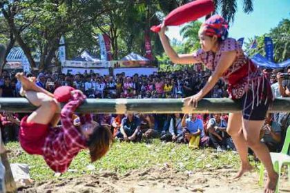 ▲ Integrantes de la comunidad Kern observan una pelea de almohadas sobre un tronco, como parte de la bienvenida al…