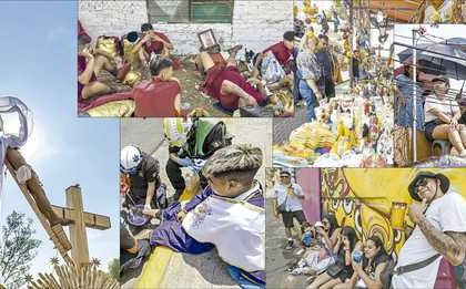 ▲ Durante la escenificación de la crucifixión de Jesús se reportó saldo blanco; sólo algunos nazarenos requirieron atención médica, mientras…
