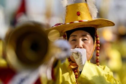▲ Un músico tradicional surcoreano toca un ënabalí, una larga trompeta de metal, el primer día del Festival Yeouido Cherry…