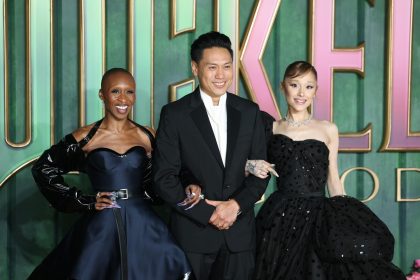 Las actrices protagonistas de Wicked, Cynthia Erivo y Ariana Grande junto al director de la película, Jon M. Chu en…