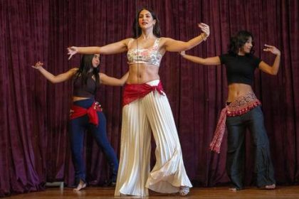 ▲ Las instructoras de baile Amie Sultan (centro), Safaa Saeed (izquierda) y Menna Emmam del Instituto Taqseem, en un ensayo…