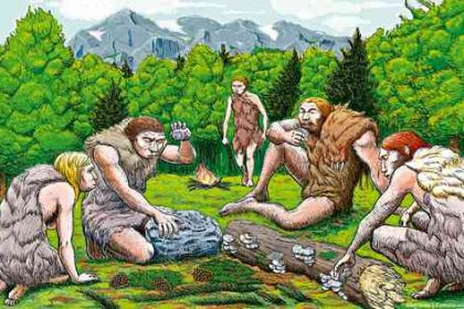 ▲ Dibujo de Abel Grau Guerrero, muestra a neandertales españoles, mayoritariamente vegetarianos, que comían setas, piñones y musgo.Foto Ap Europa…