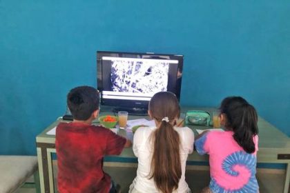▲ Emma Maride Espinoza y Andrea Pech, ambas de 9 años, estudian el comportamiento nocturno de polinizadores de la península…