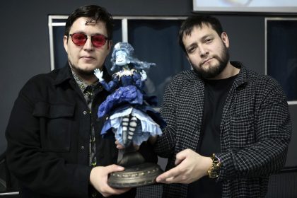 Los cofundadores de la casa productora Cinema Fantasma, Roy Ambriz (i) y Arturo Ambriz (d) posan con una figura del…