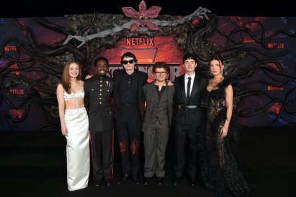 De izquierda a derecha: Sadie Sink, Caleb McLaughlin, Finn Wolfhard, Gaten Matarazzo, Noah Schnapp y Millie Bobby Brown en la…