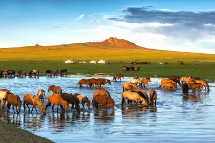 En un claro entre los densos bosques de árboles de hoja perenne, a lo largo de la ladera de la…