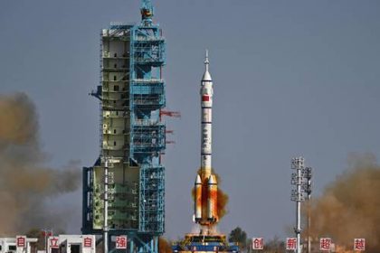 ▲ El cohete portador Larga Marcha-2F despega del Centro de Lanzamiento de Satélites de Jiuquan, en el desierto de Gobi,…